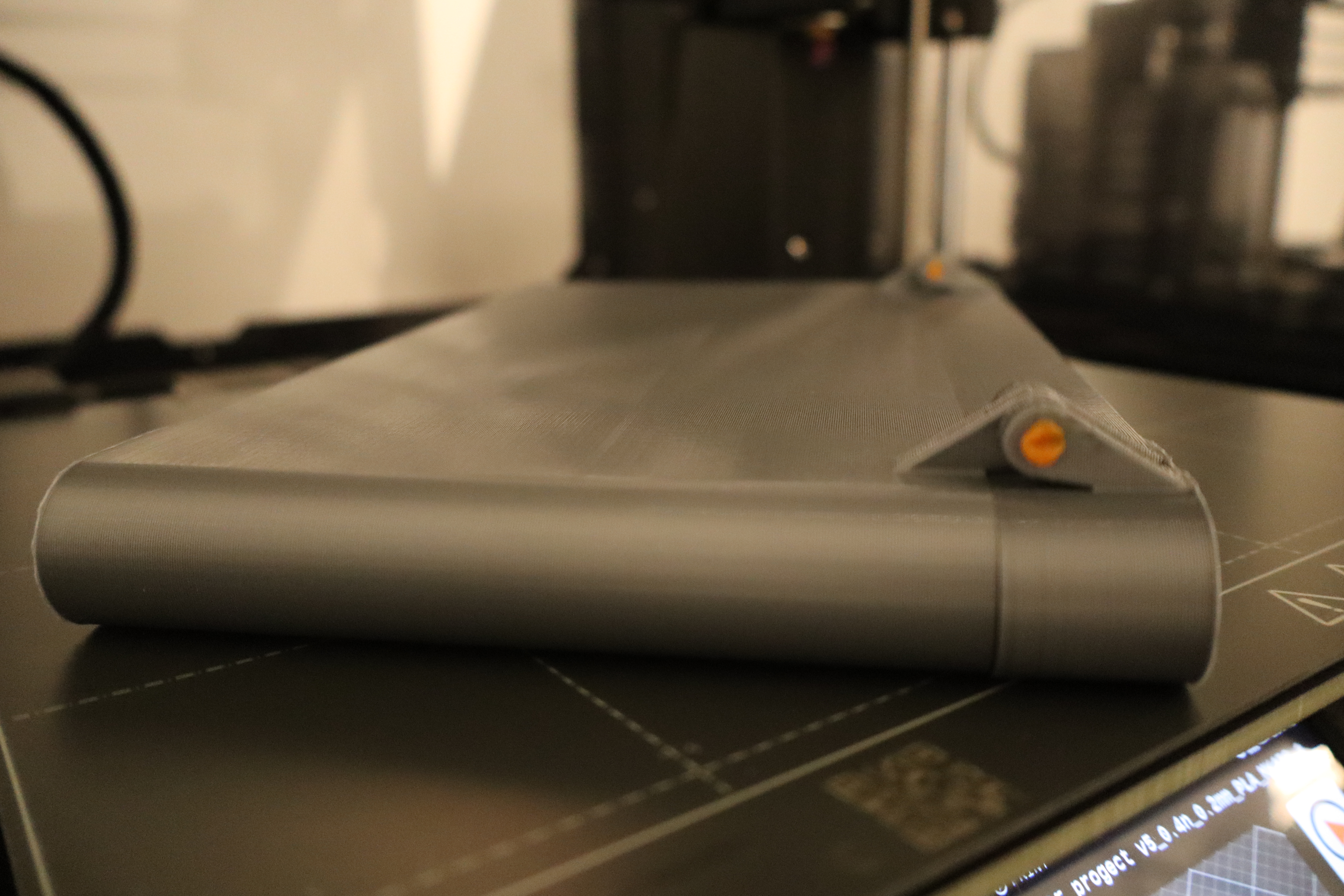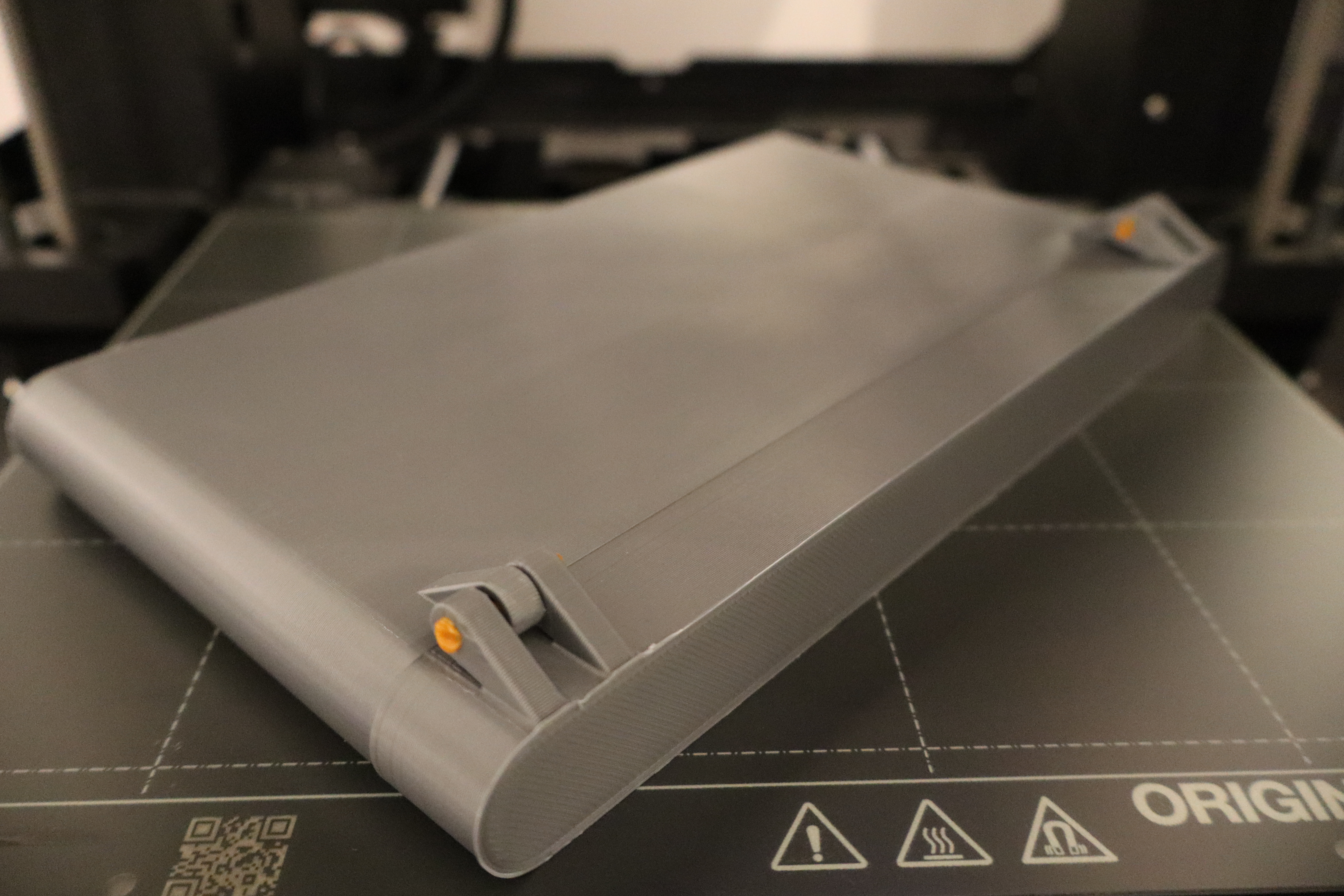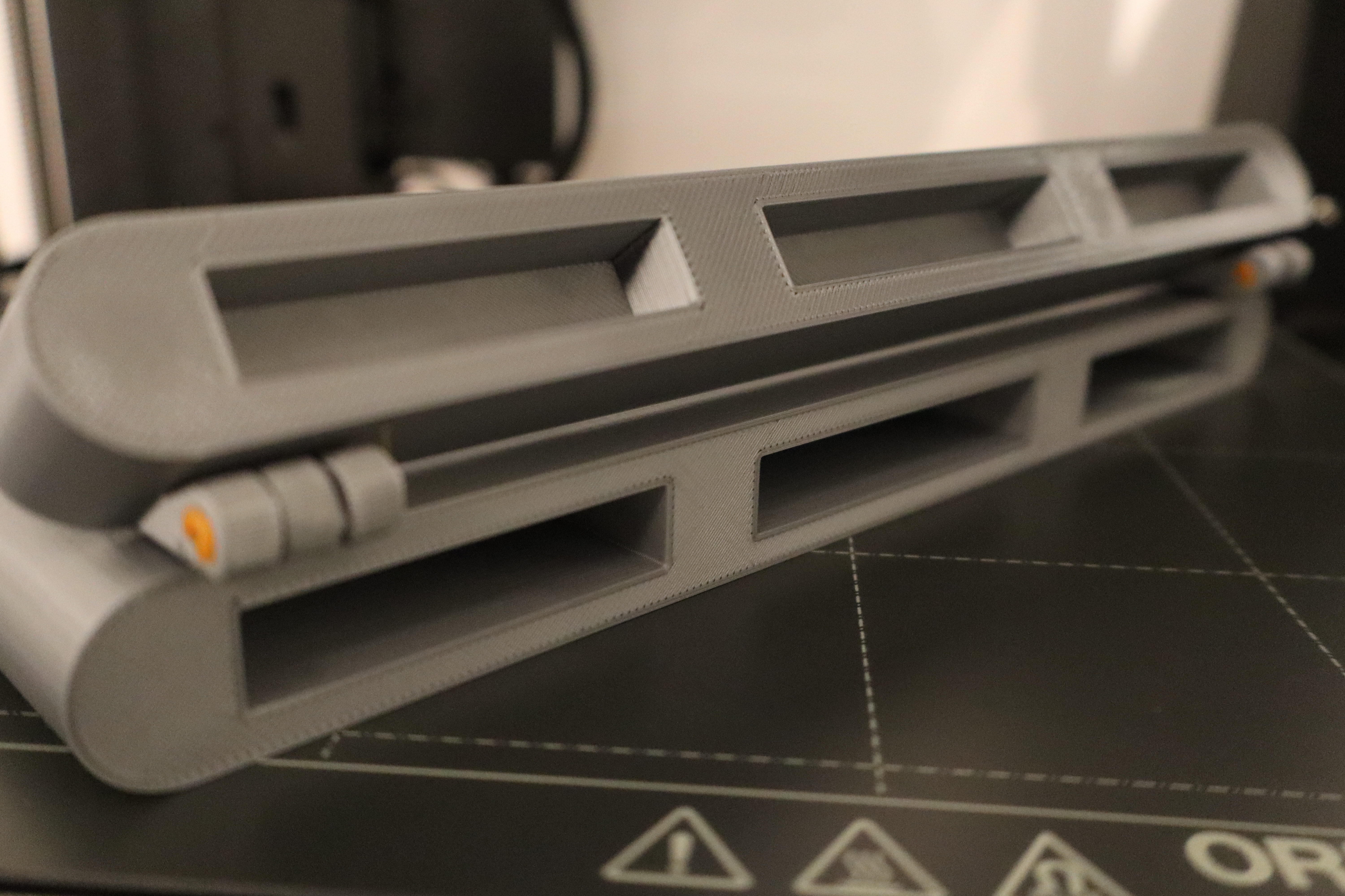 I was pretty happy with how the model turned out, but i later learned that because the hinge i designed was meant to be printed as a part of the base, it would have to be printed open with the holes down, and therefore the supports would have to print itself inside the holder, which would not only be a waste of plastic but also would be impossible to remove afterwards.